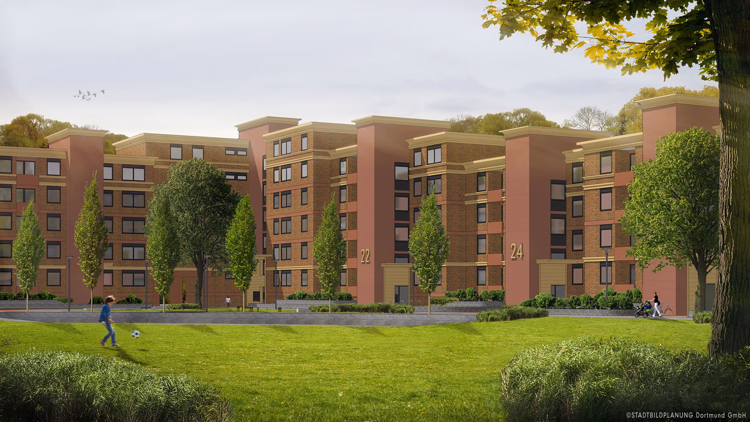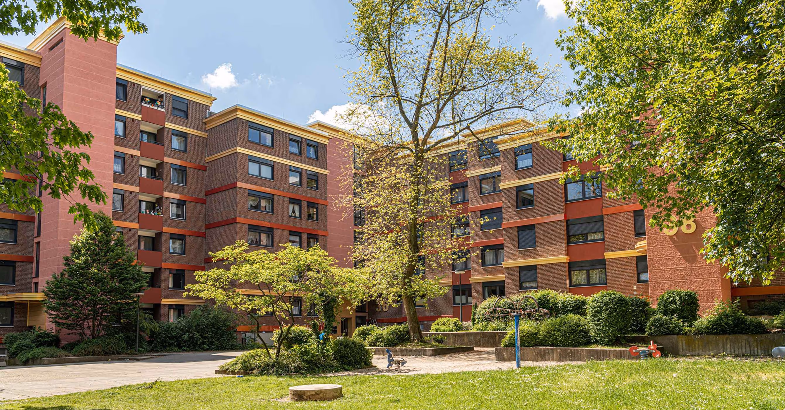Parallel zur gestalterischen Optimierung wurde das Wohnumfeld ökologisch weiterentwickelt. Der wertvolle Baumbestand des angrenzenden Rombergparks sorgt für ein hervorragendes Mikroklima und bildet einen starken natürlichen Rahmen für das Quartier.
