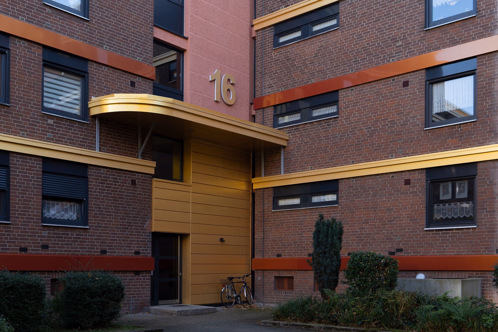 Die Farbpalette – Gold-, Bronze- und Kupfertöne – wurde nach dem Zufallsprinzip angeordnet und erzeugt ein lebendiges, aber dennoch harmonisches Fassadenspiel. Auch die Eingangssituationen erhielten eine deutliche Aufwertung: Kupferfarbene Verkleidungen markieren die Zugänge, verbessern Orientierung und Sicherheit und machen die Architektur der 60er- und 70er-Jahre wieder lesbar.
