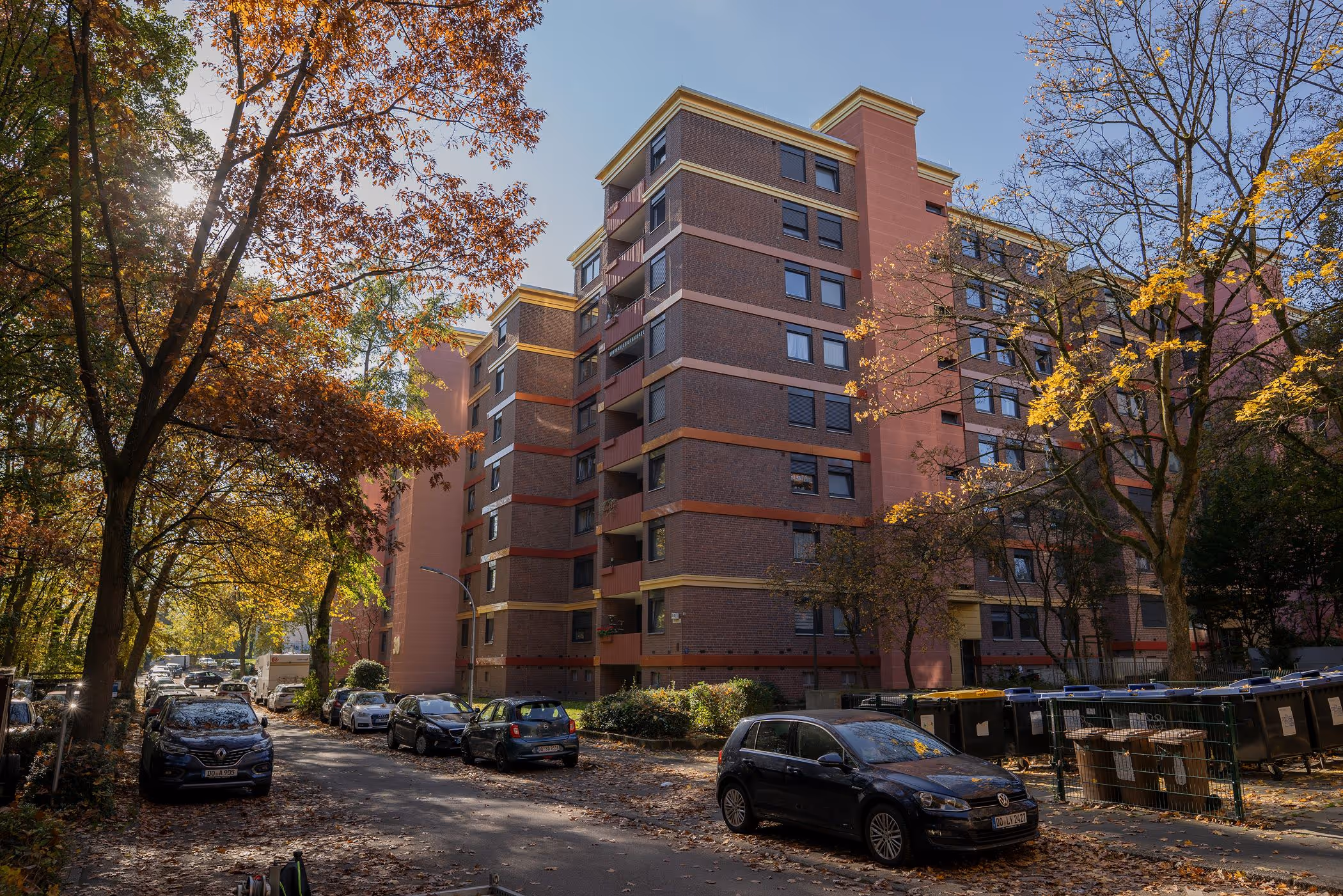 Das Quartier Am Bahnhof Tierpark liegt am Rand des Dortmunder Rombergparks und ist geprägt von einer weitläufigen Großwohnanlage aus den 1970er-Jahren. Die mäandrierenden, sechs- bis achtgeschossigen Gebäude zeichneten sich durch ihre markante Ziegelfassade aus, jedoch traten besonders an den Stirnseiten der Geschossdecken sichtbare Alterungserscheinungen zutage. Diese exponierten Betonflächen waren konstruktiv schwach, gestalterisch unruhig und standen im Widerspruch zur attraktiven Lage am Grünraum. Für den Vermieter Vonovia bot das Projekt eine Chance, im Sinne der „Great to Gold“-Strategie die vorhandene Bausubstanz nicht nur funktional zu ertüchtigen, sondern auch architektonisch aufzuwerten. Ziel war eine nachhaltige, langfristige Quartiersentwicklung, die Energieeffizienz, gestalterische Qualität und soziale Wirkung verbindet.
