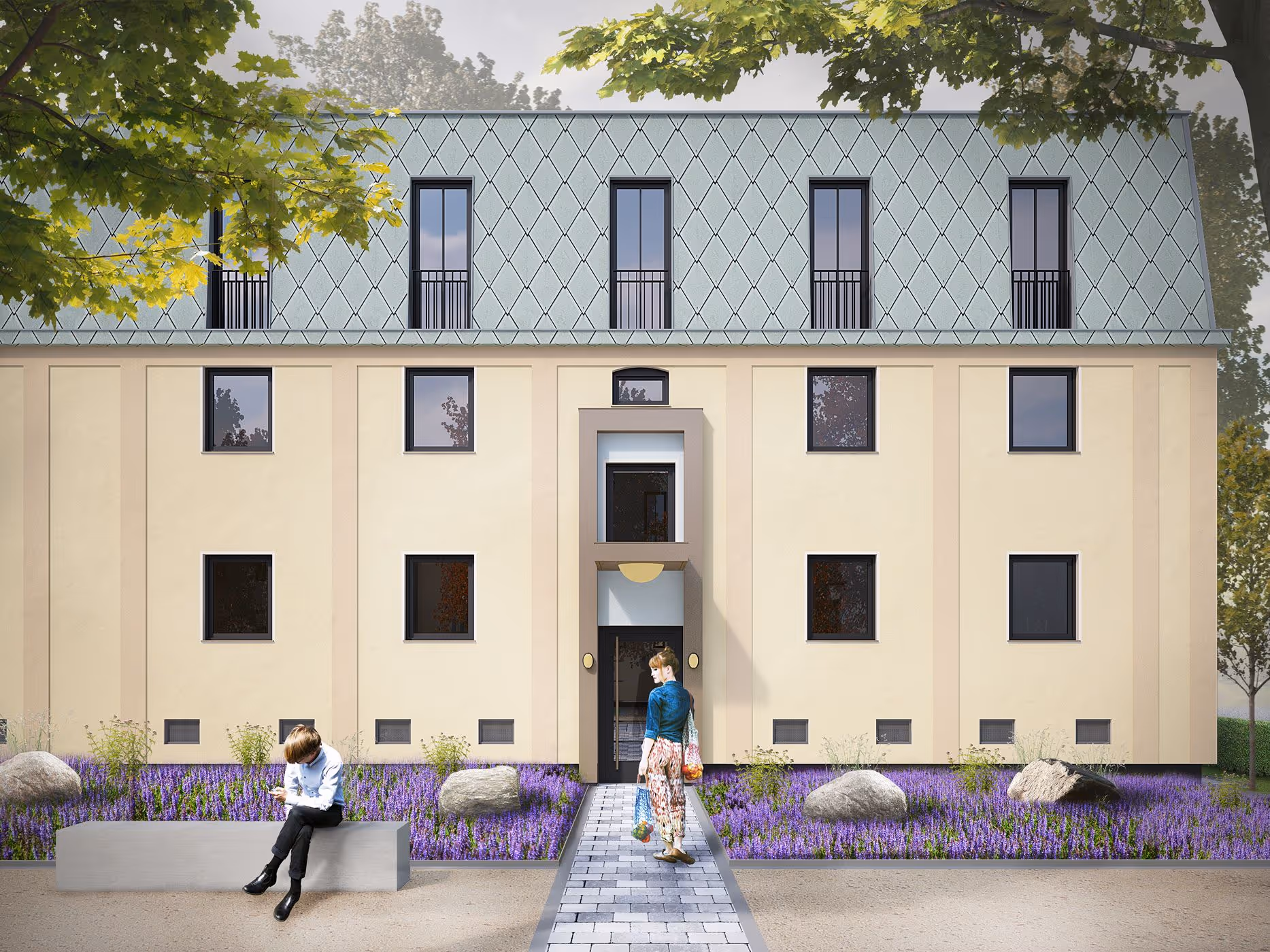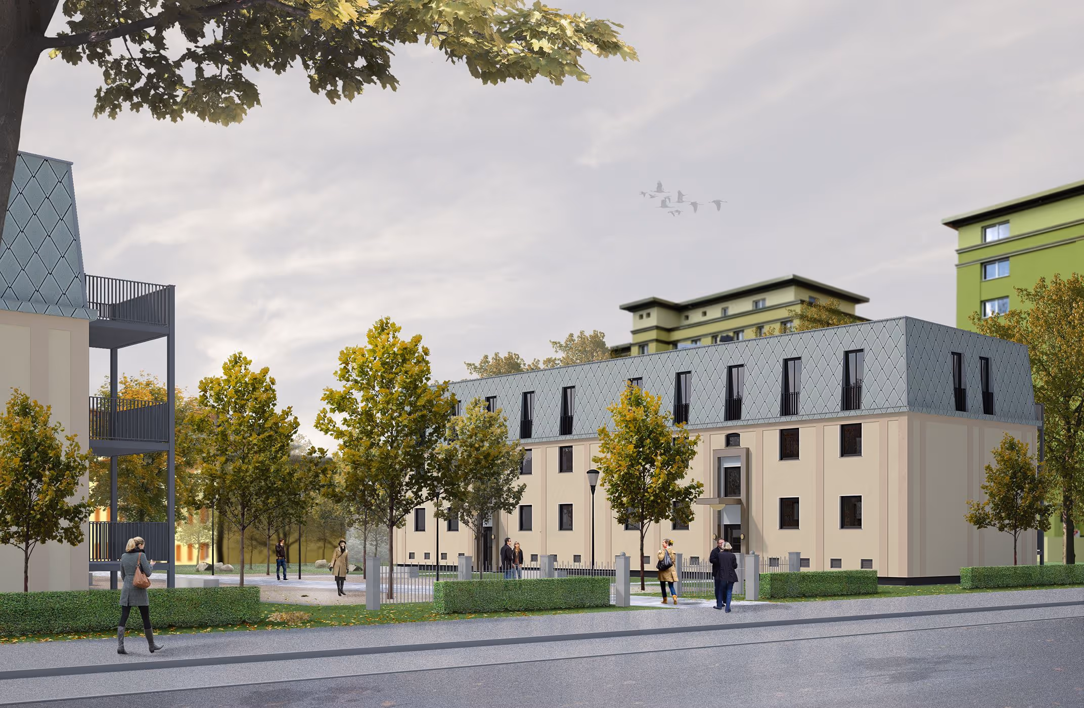 AGH Studios entwickelte gemeinsam mit Vivawest ein modulare Dachaufstockungssystem, das architektonische Qualität mit ökonomischer Effizienz verbindet. Die Gestaltung orientiert sich an den klassischen Pariser Mansarddächern des 18. und 19. Jahrhunderts: zinkartige Verkleidungen, harmonische Naturtöne und eine klare Fassadengliederung verleihen den Gebäuden eine neue urbane Präsenz. Diese ästhetische Referenz stärkt nicht nur die Identität des Quartiers, sondern schafft zudem ein zeitloses Erscheinungsbild, das sich selbstverständlich aus dem ersten Bauabschnitt der „Neuen Stadtgärten“ heraus entwickelt.