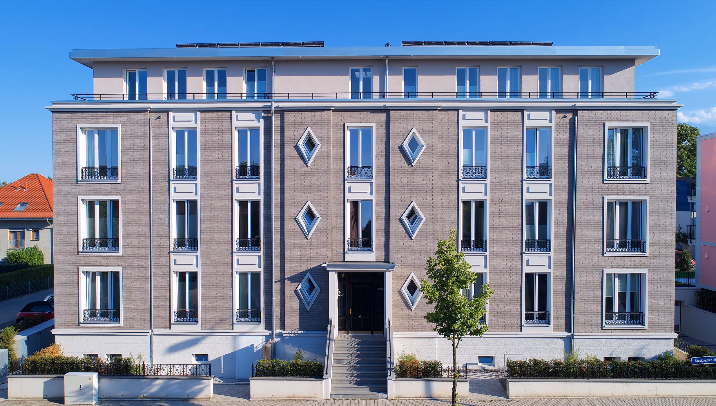 Zur Straße hin prägt eine hochwertig ausgeführte graue Klinkervorsatzschale das Erscheinungsbild und verankert das Gebäude selbstbewusst im Quartier. Die Rückseite öffnet sich mit großzügigen Balkonanlagen und einer hellen Putzfassade zum Grünraum. Innen setzt das Treppenhaus mit Natursteinböden und klarer Linienführung ein weiteres gestalterisches Statement.